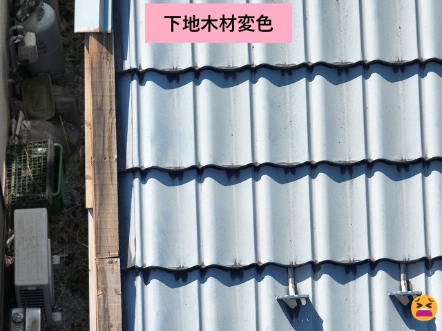 落下していたケラバ板金の内部を確認すると、下地の木材が変色し、触るともろい状態でした。