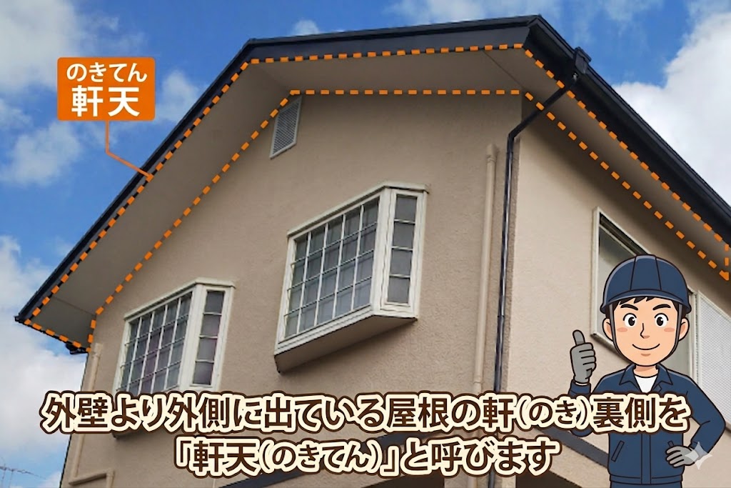 軒天とは、屋根の外壁から外側に出ている部分の裏側、いわば“屋根の裏の天井”にあたる部分です。
