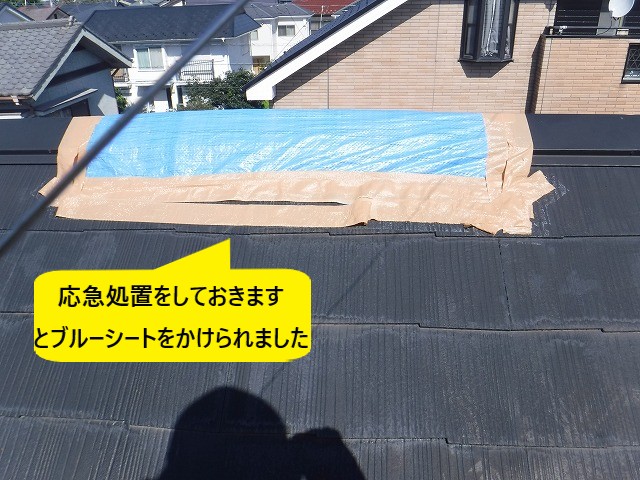 その後、「応急処置をしておきました」とブルーシートをかけられていました。