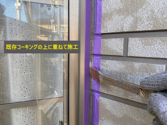 サッシの周りや換気口の周りなど、比較的劣化が軽度な箇所や、既存のコーキングの上に重ねて施工できる箇所は、「増し打ち」を行いました。こちらは、既存のコーキングの上から新しいコーキング材を充填する方法です。
