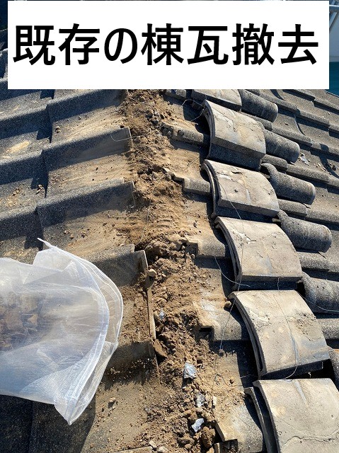 安全に配慮しながら、既存の棟瓦と中の崩れたモルタルを丁寧に撤去しました。