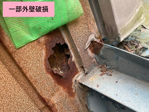 下の屋根と外壁が接する部分では、サビの進行により外壁の一部に穴が開いている状態も確認されました。