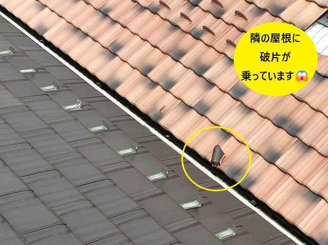 割れた瓦は敷地内に落ちており、一部の破片はお隣の屋根の上にも確認できました。