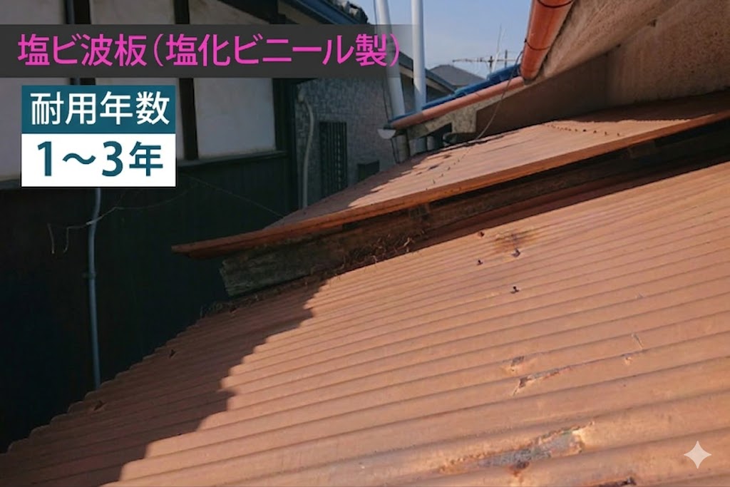 使用されていた屋根材は、昔ながらの「塩化ビニール(塩ビ)製」の波板です。