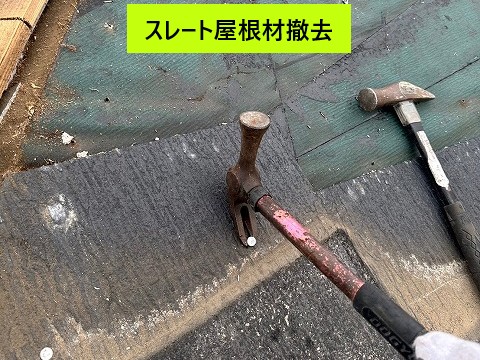 割れていたスレートを一枚ずつ丁寧に撤去。周囲を傷つけないよう慎重に作業を進めます。