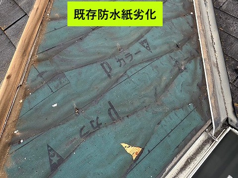 さらに屋根材の下を確認すると、防水紙(ルーフィング)も劣化しており、本来の防水機能が低下している状態でした。